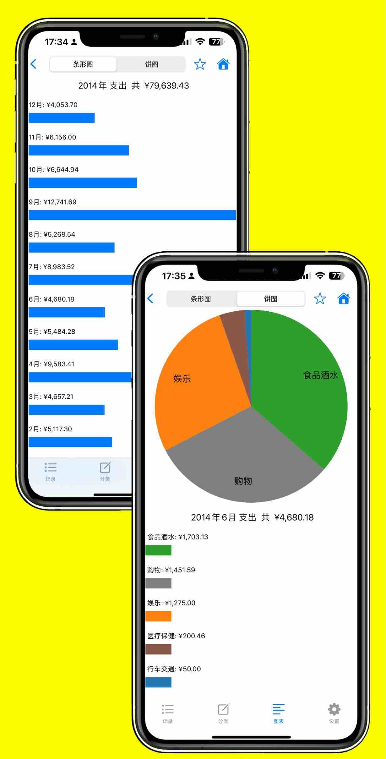 • 可视化报表:支持柱状图、饼图两种图表,对数据点按金额或时间排序