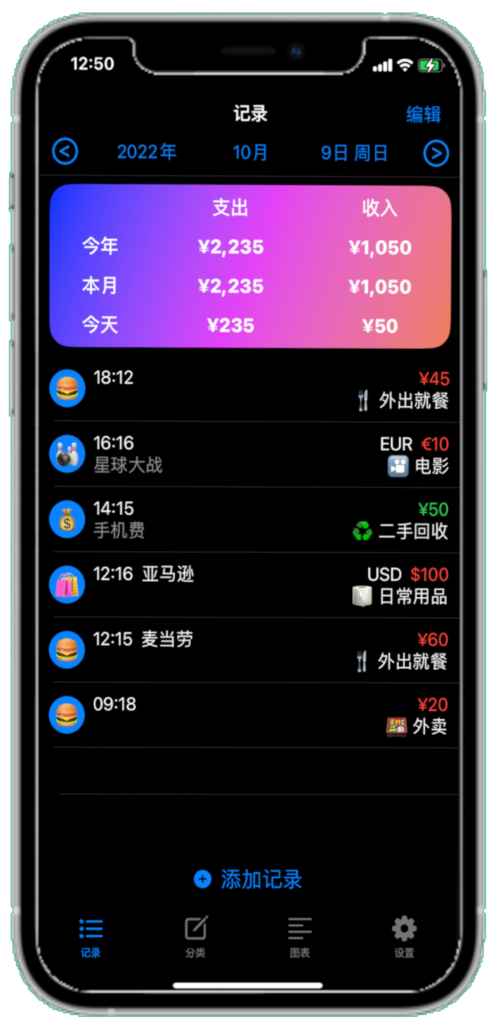 - 可以点击记录上方向下的三角形,以便按金额或时间排序记录