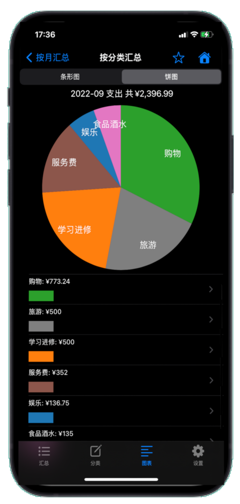 在”图表”首页,点击总收入或总支出,进入”图表”汇总页面。这里可以按记录的不同字段使用图表进行汇总统计。如按年汇总统计,每一年再按月进行汇总统计等等,点击”图表”首页“汇总方式和顺序”旁边的“编辑”就可以更改。