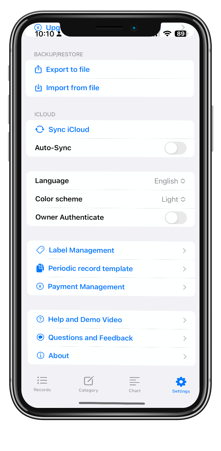 Backup/restore data via CSV file. Sync data to iCloud