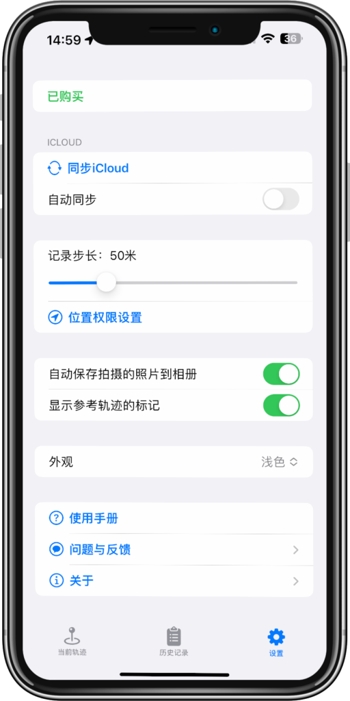 自动同步应用中的轨迹、地点、标记数据会通过iCloud自动同步到其他设备上(不能关闭此功能)。